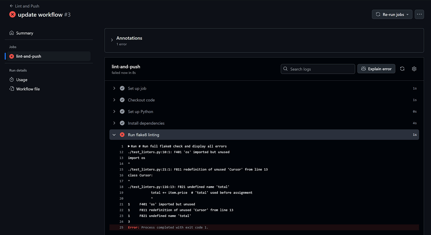 In the above screenshot I ran flake8 using GitHub Actions on my repo. For more information about GitHub Actions refer to this documentation.