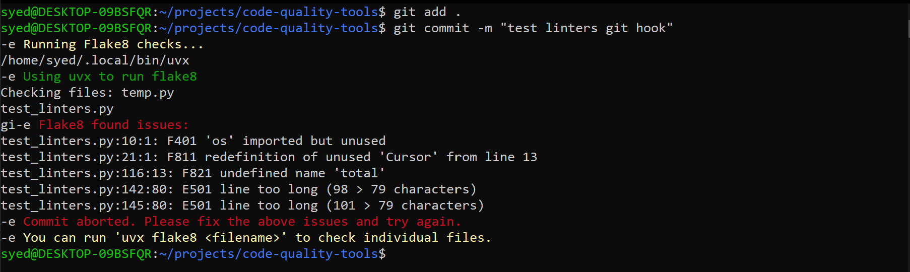 uvx flake8 test_linters.pyruns the linter on the file without changing the code, giving you output of what errors/warnings the linter found.