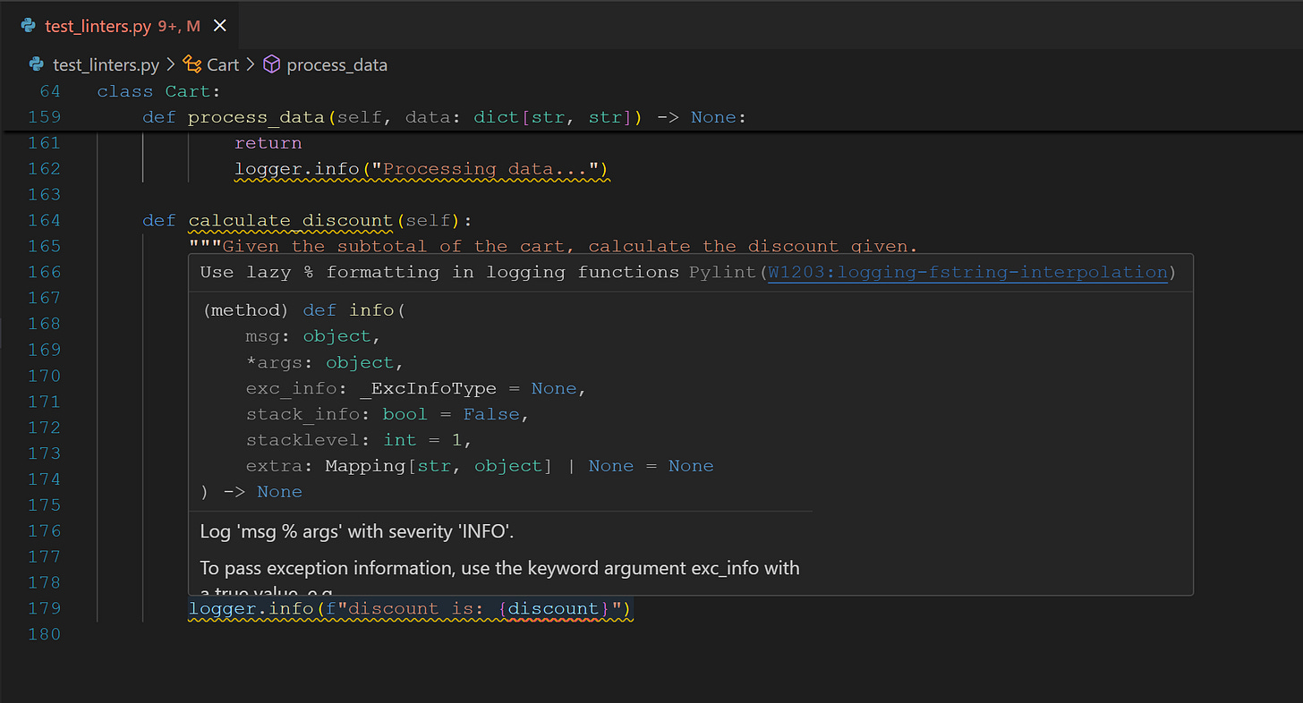 From the output it looks like ruff was able to identify 15 of the 16 errors that I initially introduced. After going through the errors in detail, it actually missed one of the errors, and identified another one. You can see in the output above that the last error is Logging statement uses f-string, which I did not realize was problematic in any way. Similar to pylint, the VSCode extension links you to the error in their documentation, with an explanation of why this is problematic. The actual issue in this code is that the variable discount is potentially being used before it's assigned, since its assignment was wrapped in if statements. Pylint was able to catch that but ruff missed it.